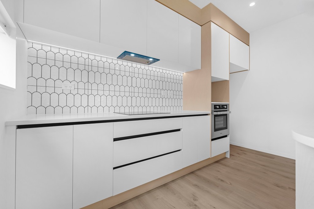 - Granite kitchen benchtop, soft close doors and drawers with premium quality kitchen appliances including oven, dishwasher, rangehood, wastemaster, fridge tap, under-mounted double sink, footlights, and rubbish bin